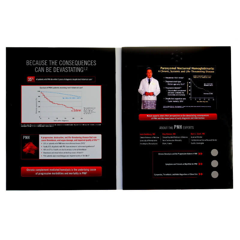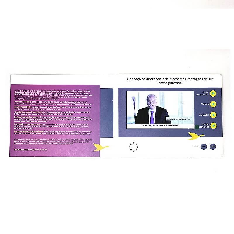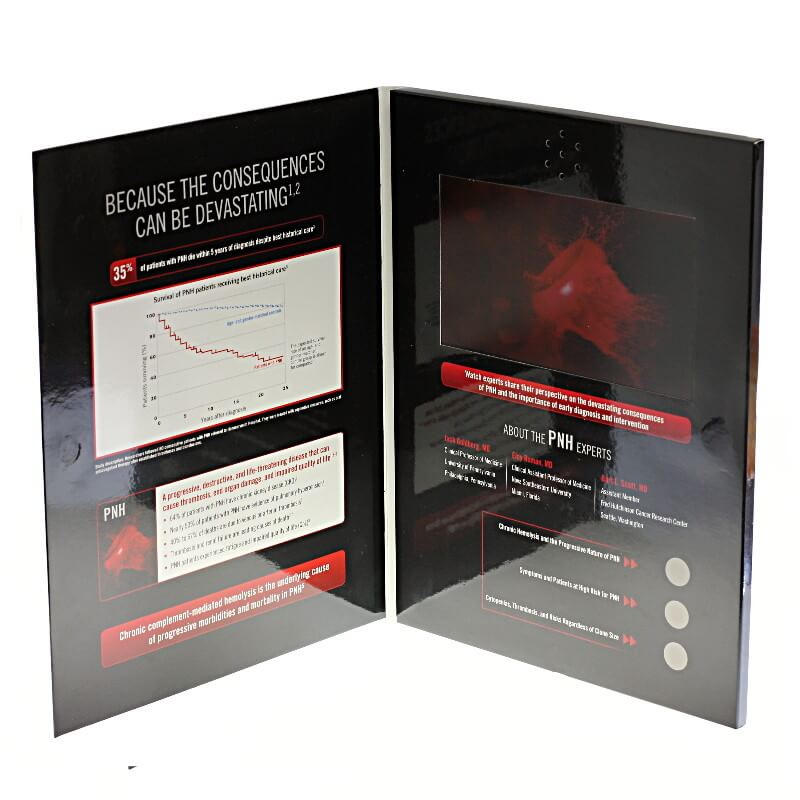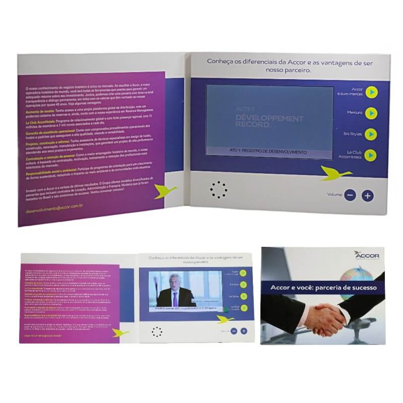 Video brožura (videobooklet) - digitální prezentace nové generace! Tato hi-tech prezentace dozajista zaujme pozornost Vašich klientů. LCD displej zasazený v luxusních prezentačních deskách, potištěných ve Vašem designu. Po otevření desek se ve smyčce začnou přehrávat videosoubory, které mohou být rovněž spuštěny individuálními tlačítky. Oblíbená je rovněž varianta, kdy jednotlivá tlačítka spouští stejné video v různých jazykových mutacích. Zvuk hraje ze zabudovaného reproduktoru nebo přes sluchátka. Možnost přidání tlačítek pro ovládání hlasitosti. Skvěle se hodí jako prezentace firmy či produktu, efektní pozvánka na akce nebo třeba jako originální PFko. Videa je možné po přehrání nahradit jinými, díky dobíjecí baterii je možné video brožury používat dlouhodobě.