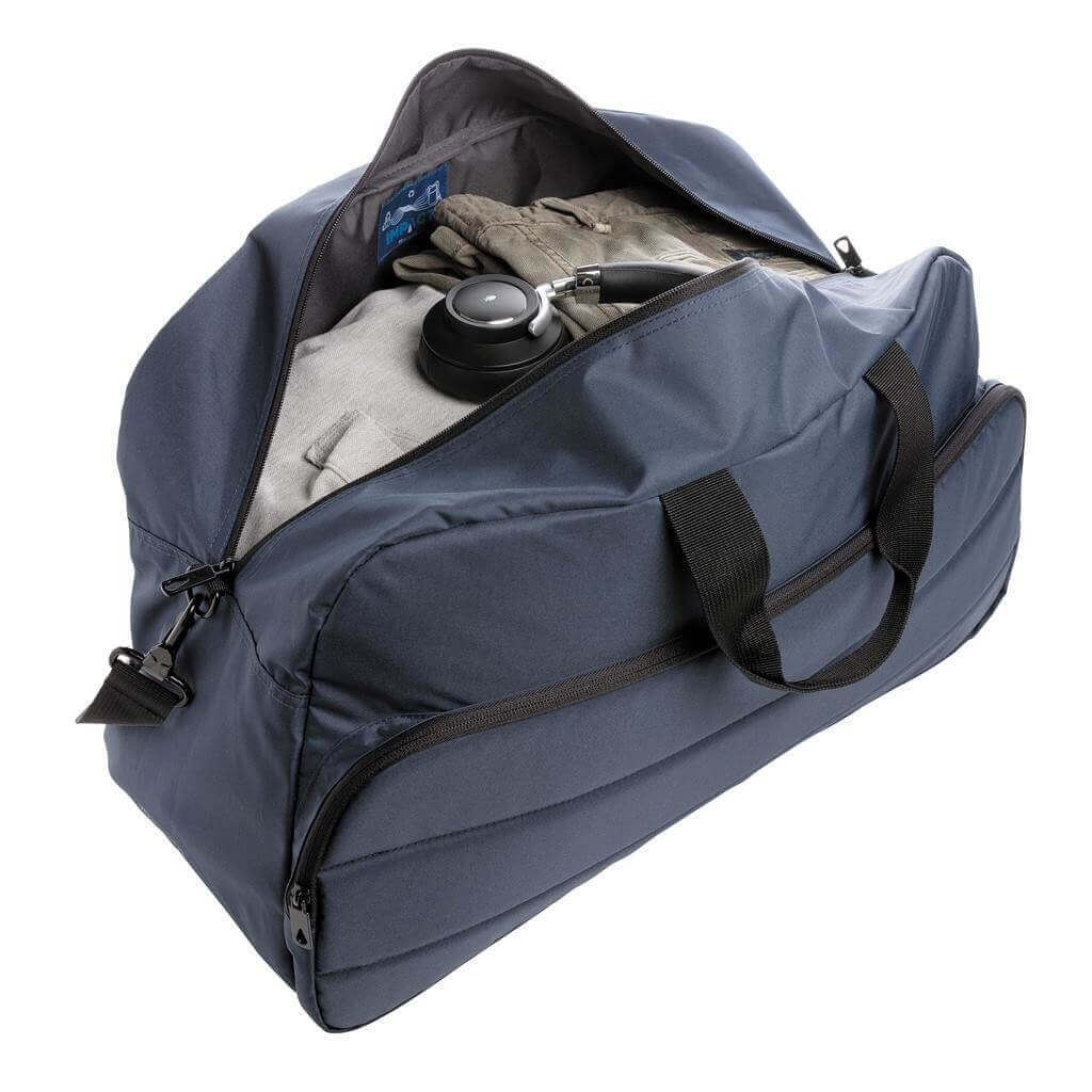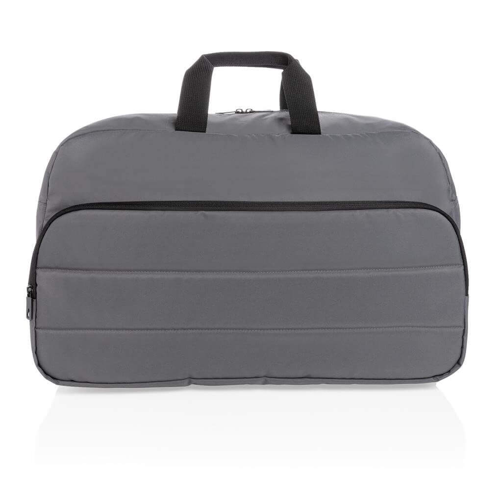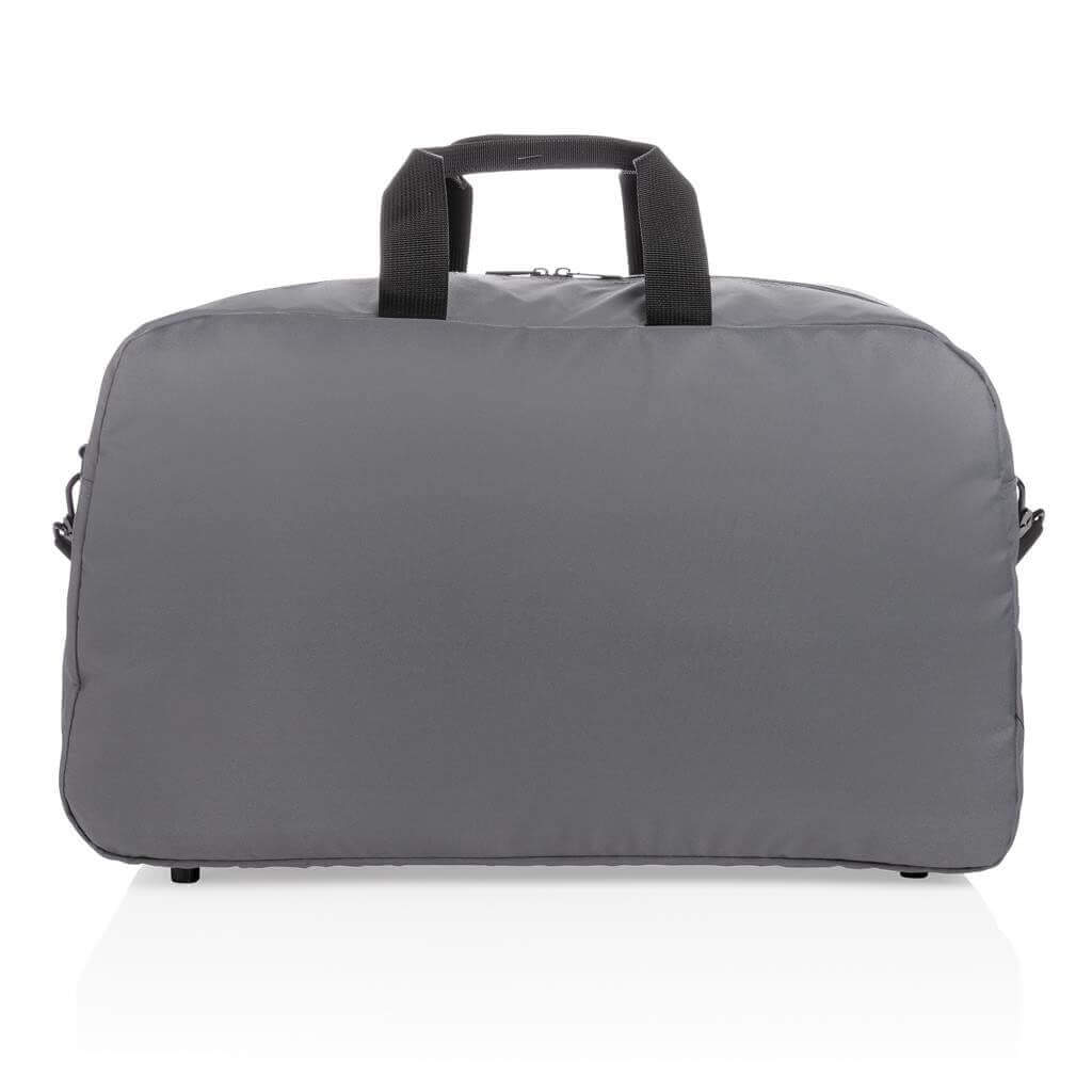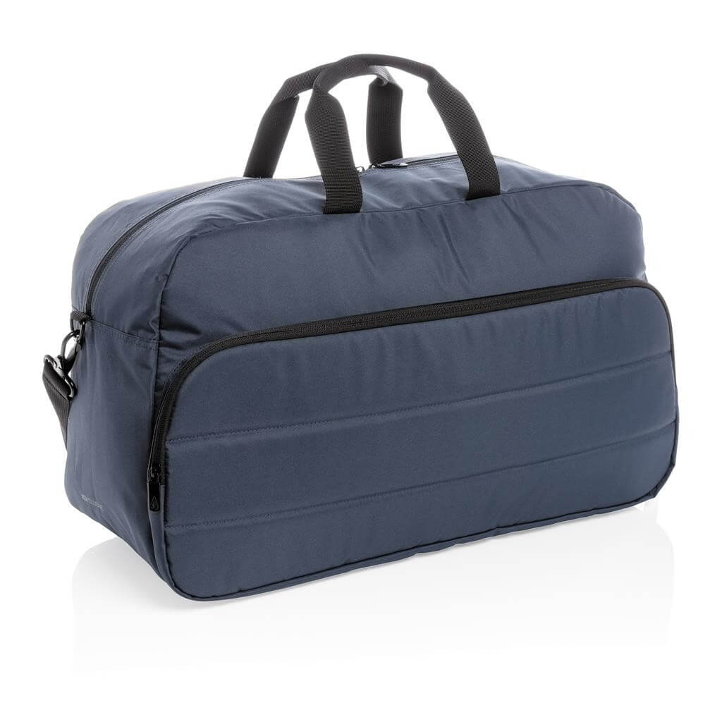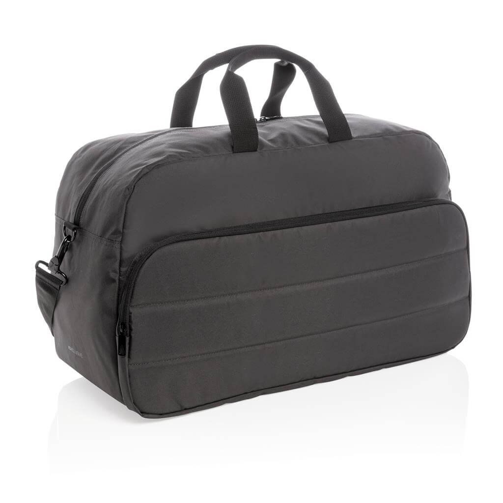 Moderní víkendová taška v jednoduchém čistém designu ideálním na cestování, vyrobená z RPET AWARE™. Rozměrný hlavní oddíl poskytuje dostatek prostoru na krátký výlet, 2 síťové kapsy pro organizaci drobností. Přední kapsa na zip s 2 malými kapsami a 2 poutky na pera. Vnější část i vnitřní podšívka jsou vyrobeny ze 100 % polyesteru AWARE™ získaného z recyklovaných PET lahví. AWARE™ využívá skutečně recyklované materiály, které jsou použitím speciální technologie dohledatelné od jejich zdroje. Recyklace má pozitivní vliv na životní prostředí a při výrobě šetří obrovské množství vody. Bez PVC.