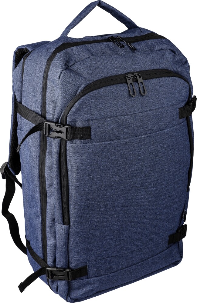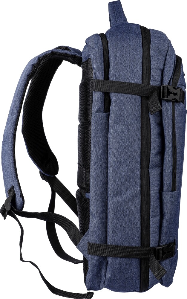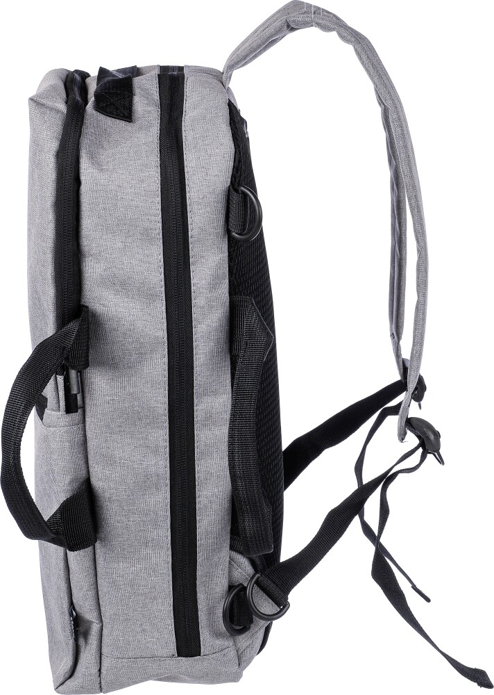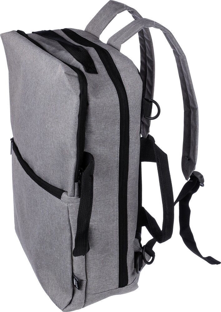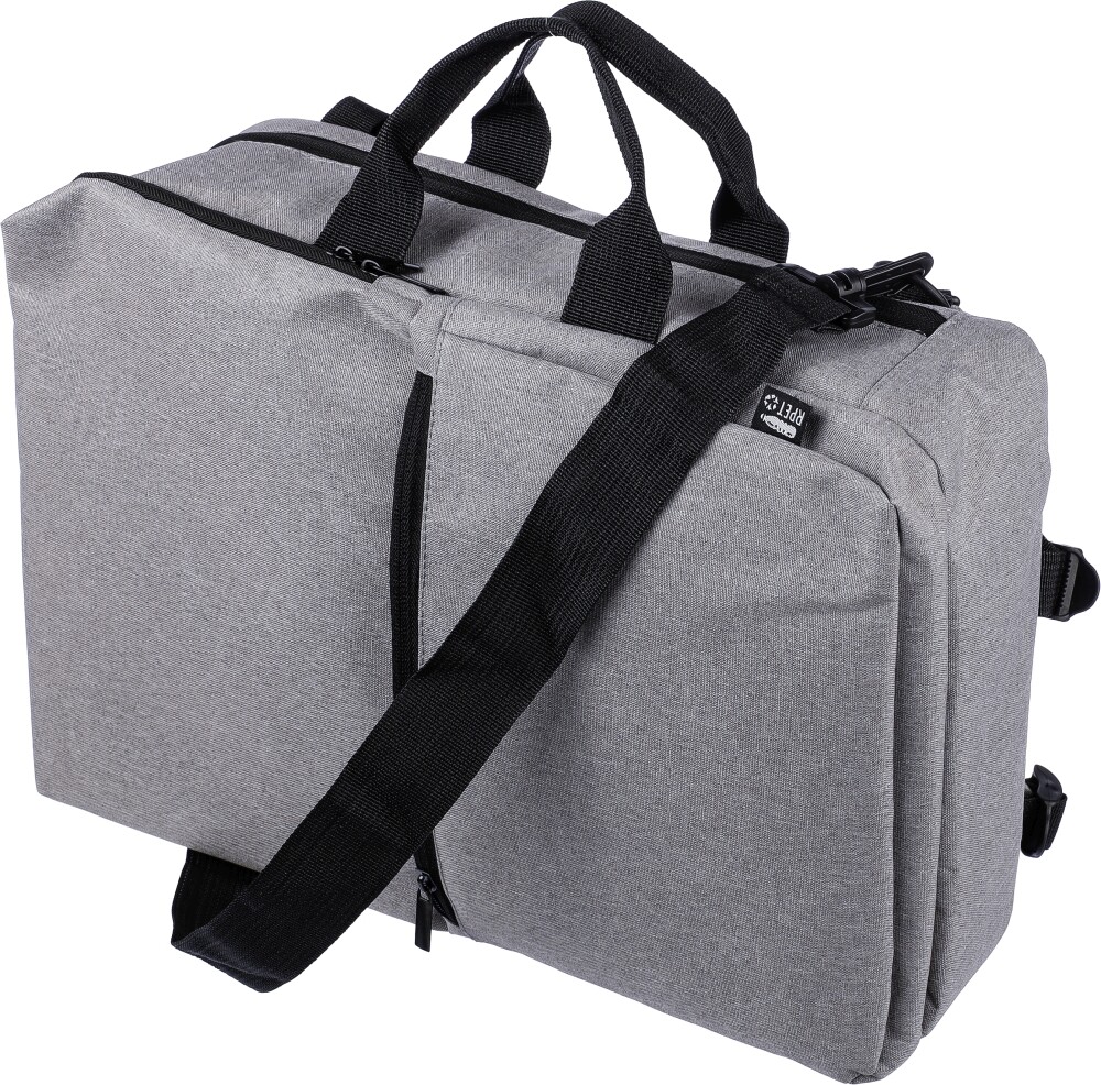 Batoh z 300D recyklovaného RPET polyesteru, který lze nosit také jako tašku na notebook (17“). Batoh má vnitřní podšívku z 210D polyesteru, poutko k uchopení nahoře (jako batoh) a na boku (jako taška na notebook) a popruh k připnutí na rukojeť cestovního kufru. Obsahuje kapsu na notebook uzavíratelnou na suchý zip, dvě velké kapsy uzavíratelné na zip, kapsu proti krádeži a USB-A port. Batoh má odvětrávanou a vypolstrovanou zádovou část. Rozměry: 46 × 32 × 20 cm. Cena nezahrnuje recyklační poplatek..