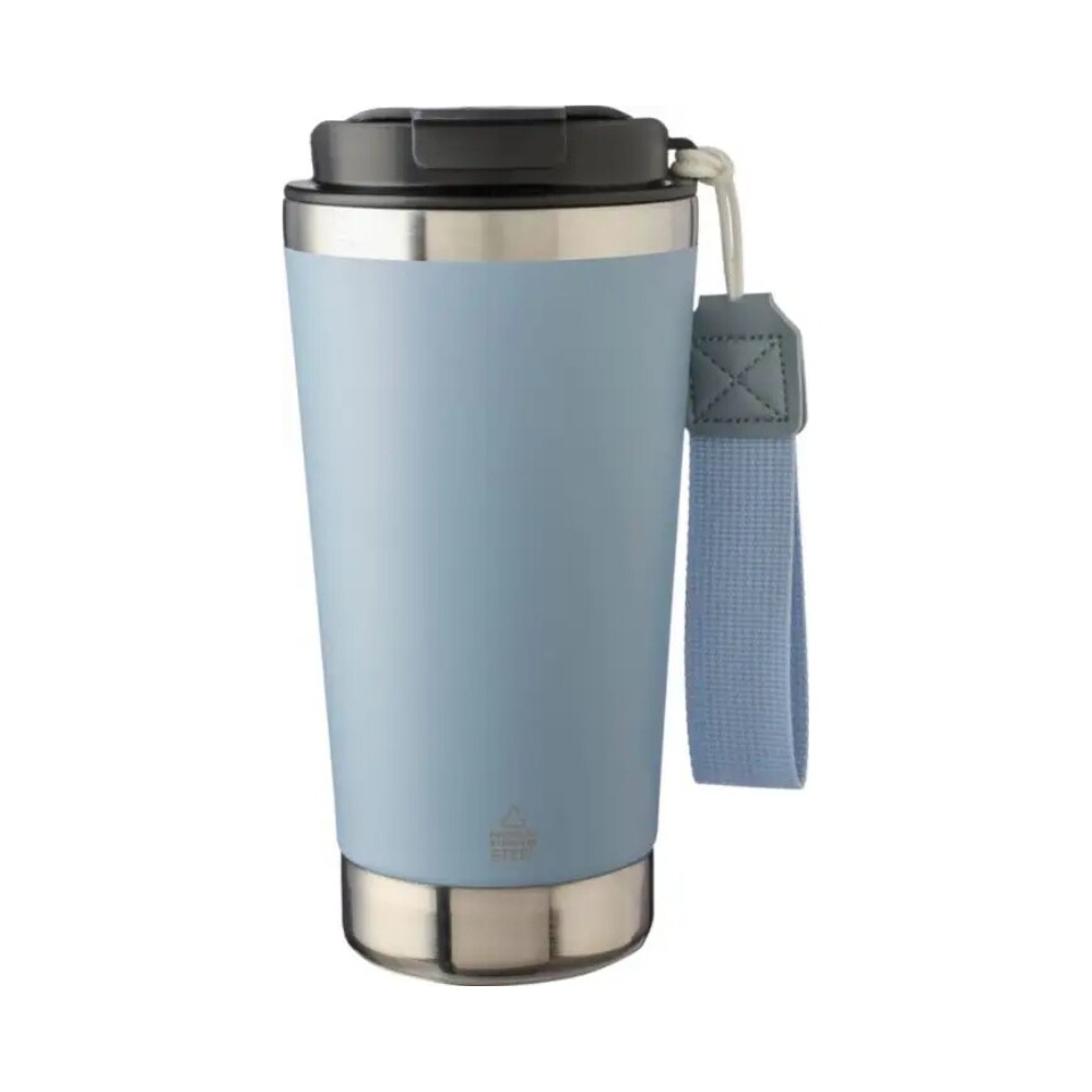 Dvoustěnný hrnek z recyklované nerezové oceli (500 ml) s víčkem z PP a odpovídajícím popruhem na nošení. Vnitřek je vyroben z nerezové oceli 304 a vnější strana z nerezové oceli 201. Udrží obsah teplý 5 hodin a studený 8 hodin. Na lahvi je vyryto recyklované logo. Jednotlivě baleno v hnědé kartonové krabici. Rozměry: 9 x 9 x 18 cm