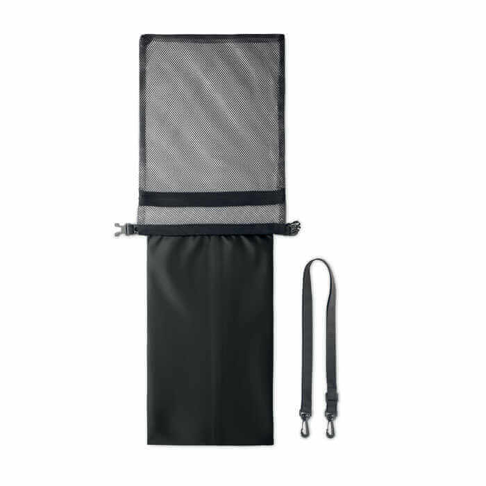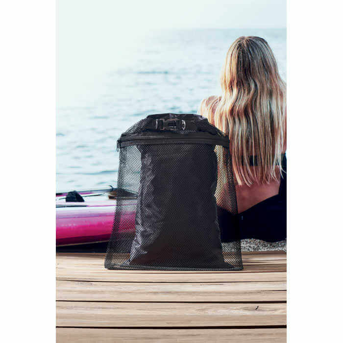 Vodotěsný vak 210 RPET v síťovaném pouzdře RPET se zipem. Udrží vaše věci v suchu, když se pohybují v blízkosti vody. Do tohoto vodotěsného vaku můžete při vodních aktivitách uložit telefon, peněženku, peníze a další předměty, aby zůstaly v bezpečí a suchu. Ideální na loď nebo na pláž. S objemem 6 l máte dostatek prostoru pro uložení svých věcí. Vak i síťované pouzdro jsou vyrobeny z recyklovaného PET plastu.