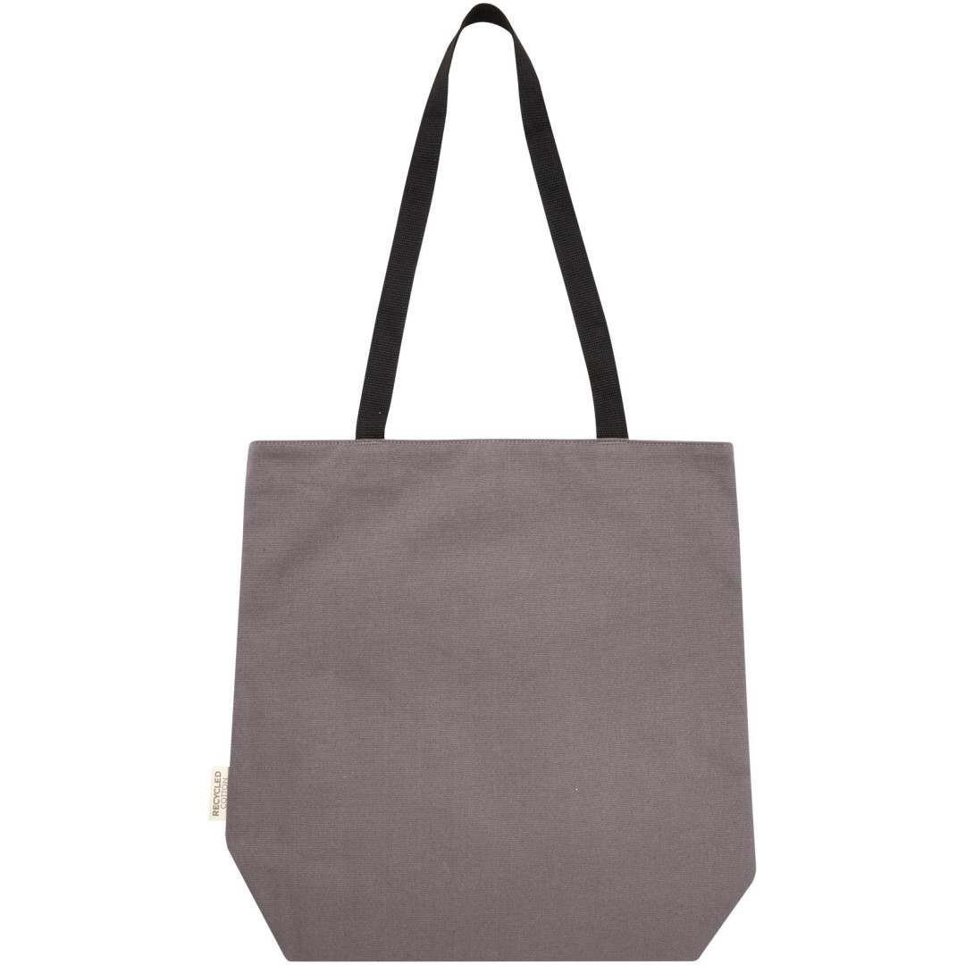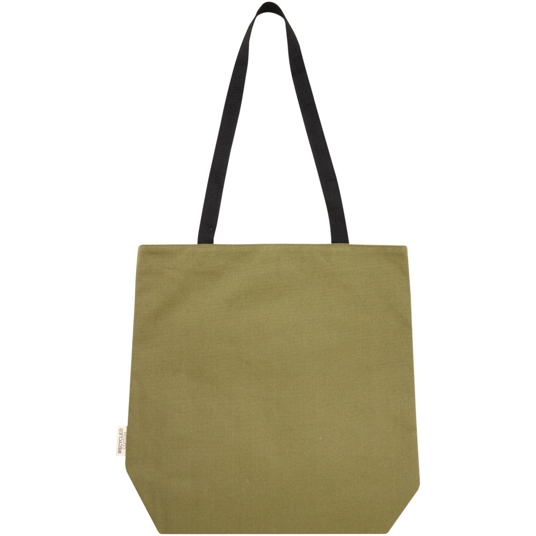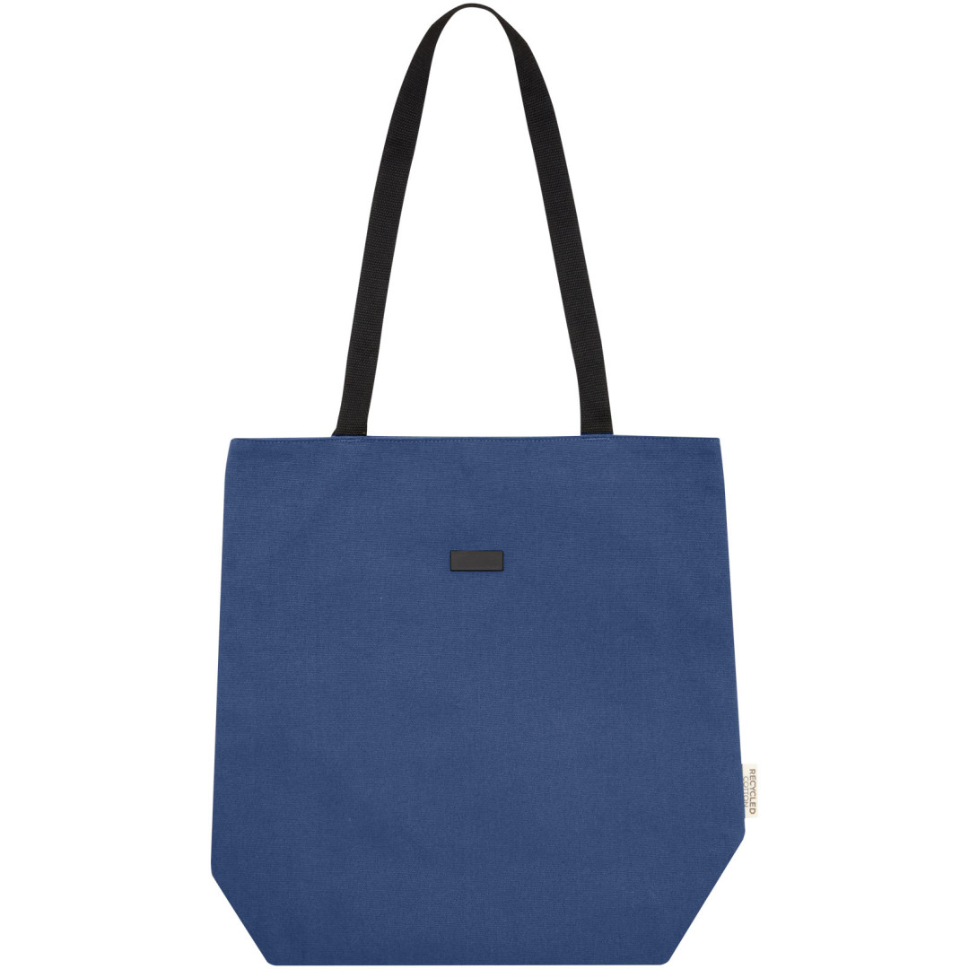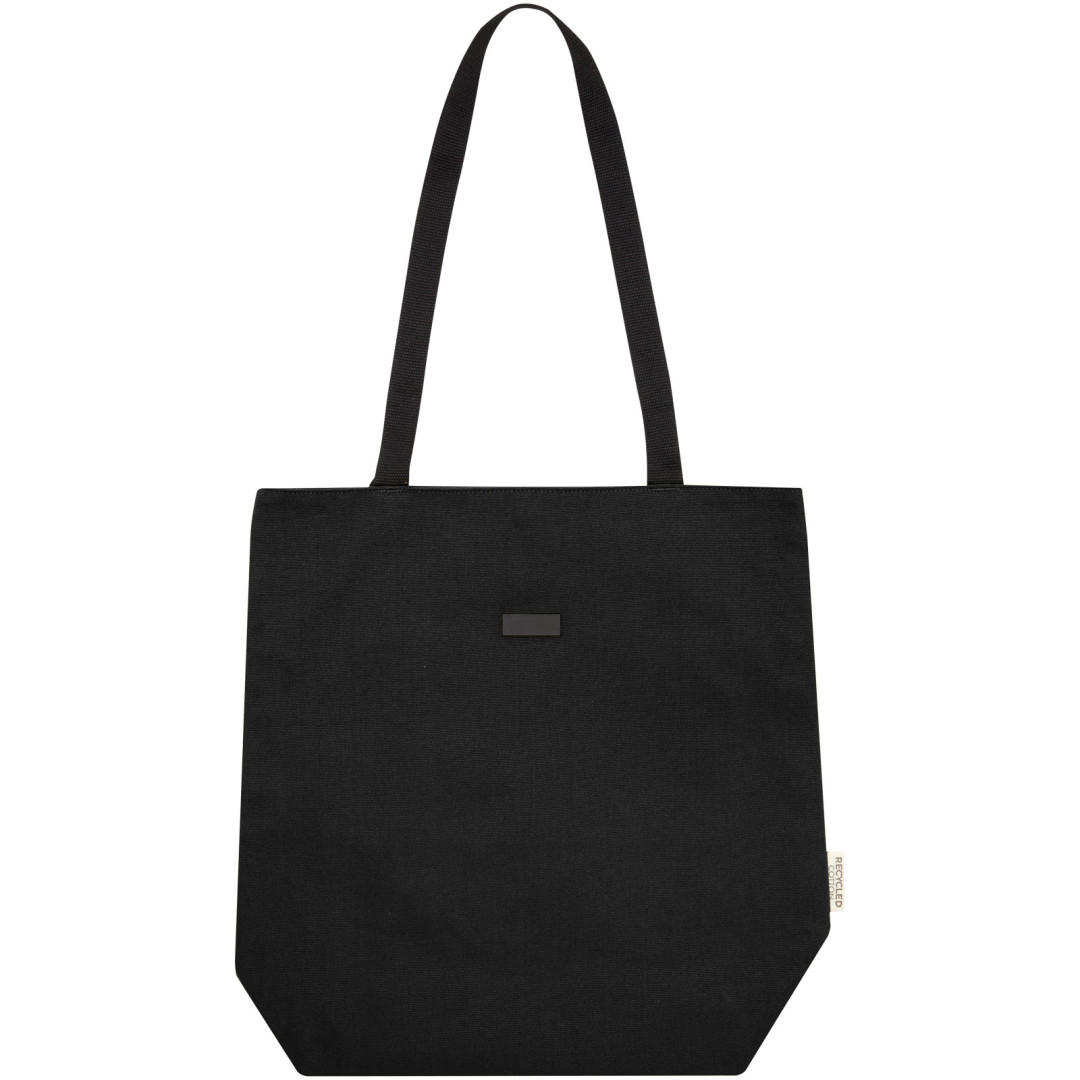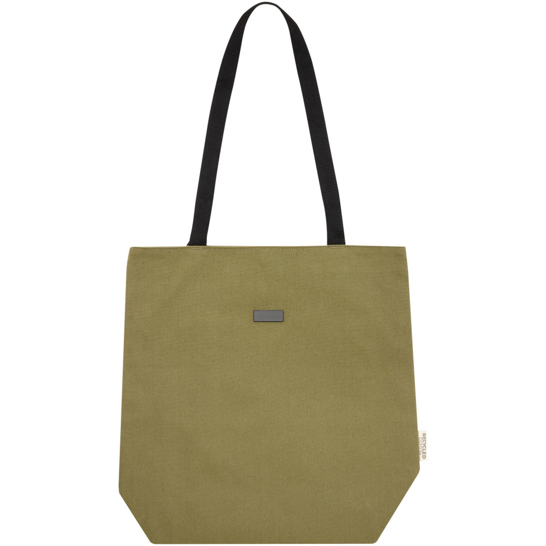 Nákupní taška vyrobená z GRS certifikovaného recyklovaného plátna a GRS certifikované RPET podšívky. Tato všestranná nákupní taška má polstrovanou přihrádku na 15" notebook a dvě vnitřní kapsy na telefon, peněženku nebo příslušenství, snadné zapínání na knoflík a pohodlné bavlněné rukojeti. Díky dekorativní kovové desce vynikne logo s jemným a matným povrchem. 80% GRS certifikovaná recyklovaná bavlna, 20% Bavlna.