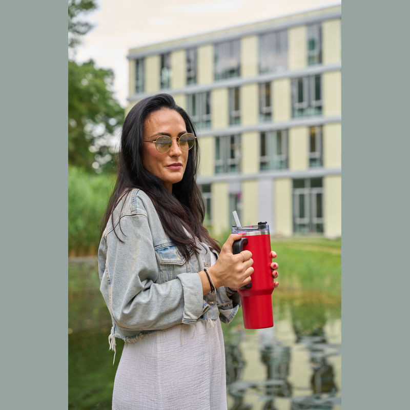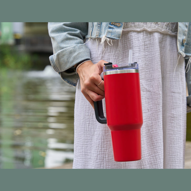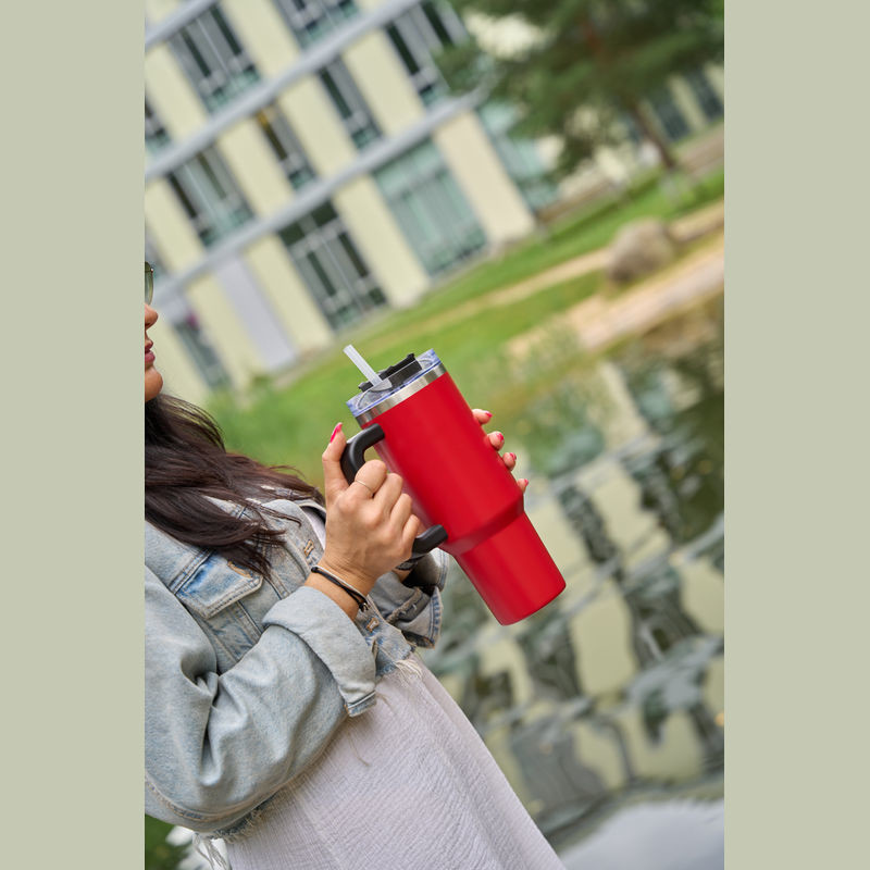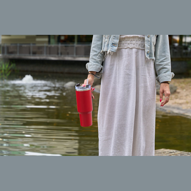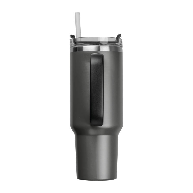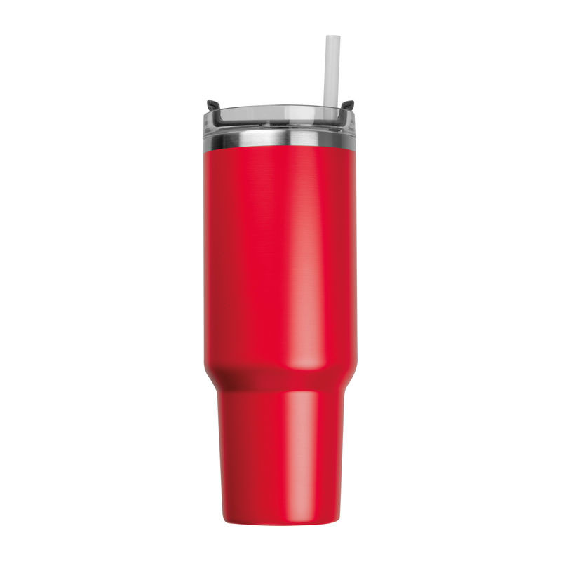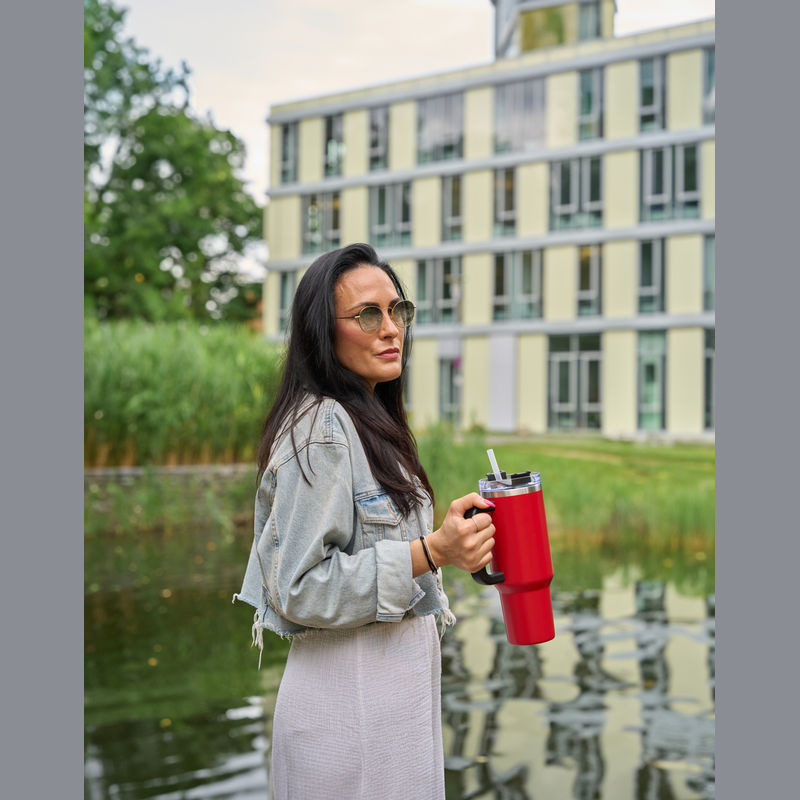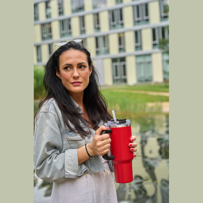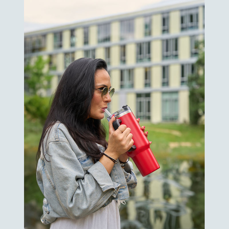 Nerezová termoska bez obsahu BPA s dvojitou vakuovou izolací a objemem 1200 ml, udrží nápoje horké až 2 hodiny a studené 4 hodiny. Obsahuje opakovaně použitelnou brčko, ergonomickou rukojeť a vejde se do standardních držáků na nápoje.