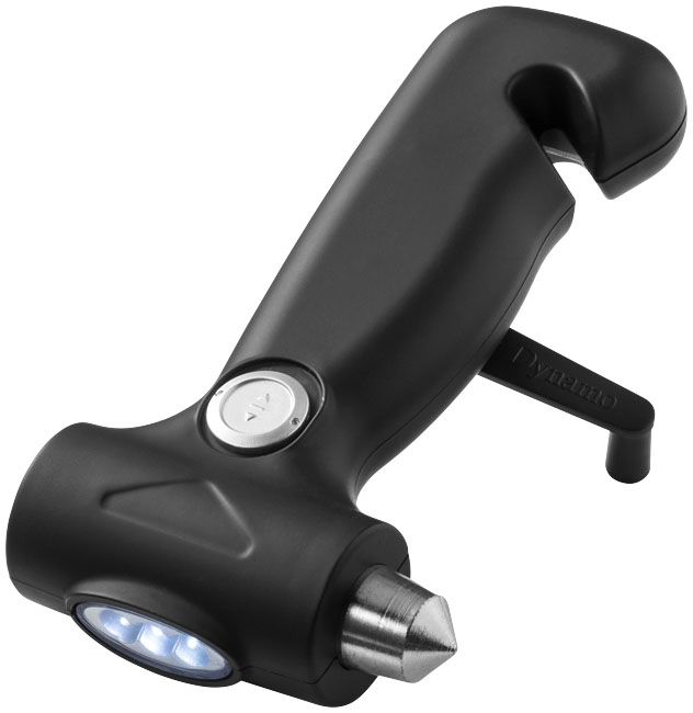 Záchranný nástroj do automobilu Node 3-v-1. Záchranný bezpečnostní nástroj tři-v-jednom obsahuje kladívko k rozbití okna, řezačku bezpečnostního pásu a blikačku s dynamem. Páčka pro výrobu energie. Nejsou zapotřebí ž