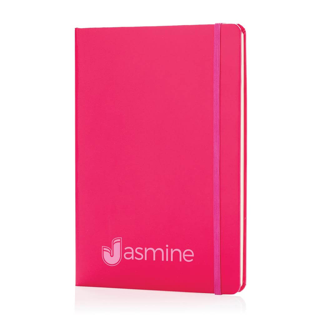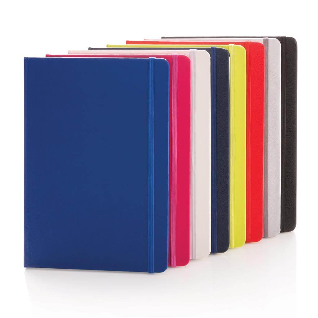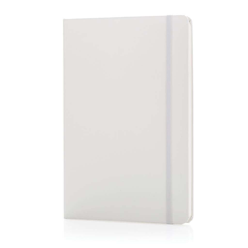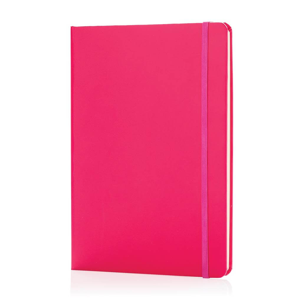 Linkovaný základní poznámkový blok A5 s pevnými deskami s elastickým zavíráním a záložkou ze stuhy. 144 listů papíru s gramáží 70 g/m2. Krémové stránky. PMS color 1: Black PMS color 1: 428 PMS color 1: White PMS color 1: Red 032 PMS color 1: 286 PMS color 1: 282
