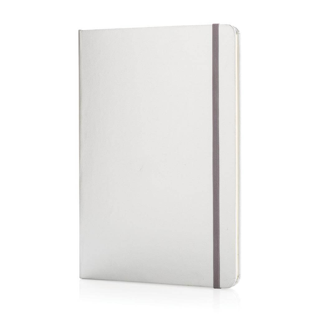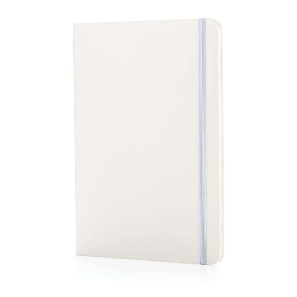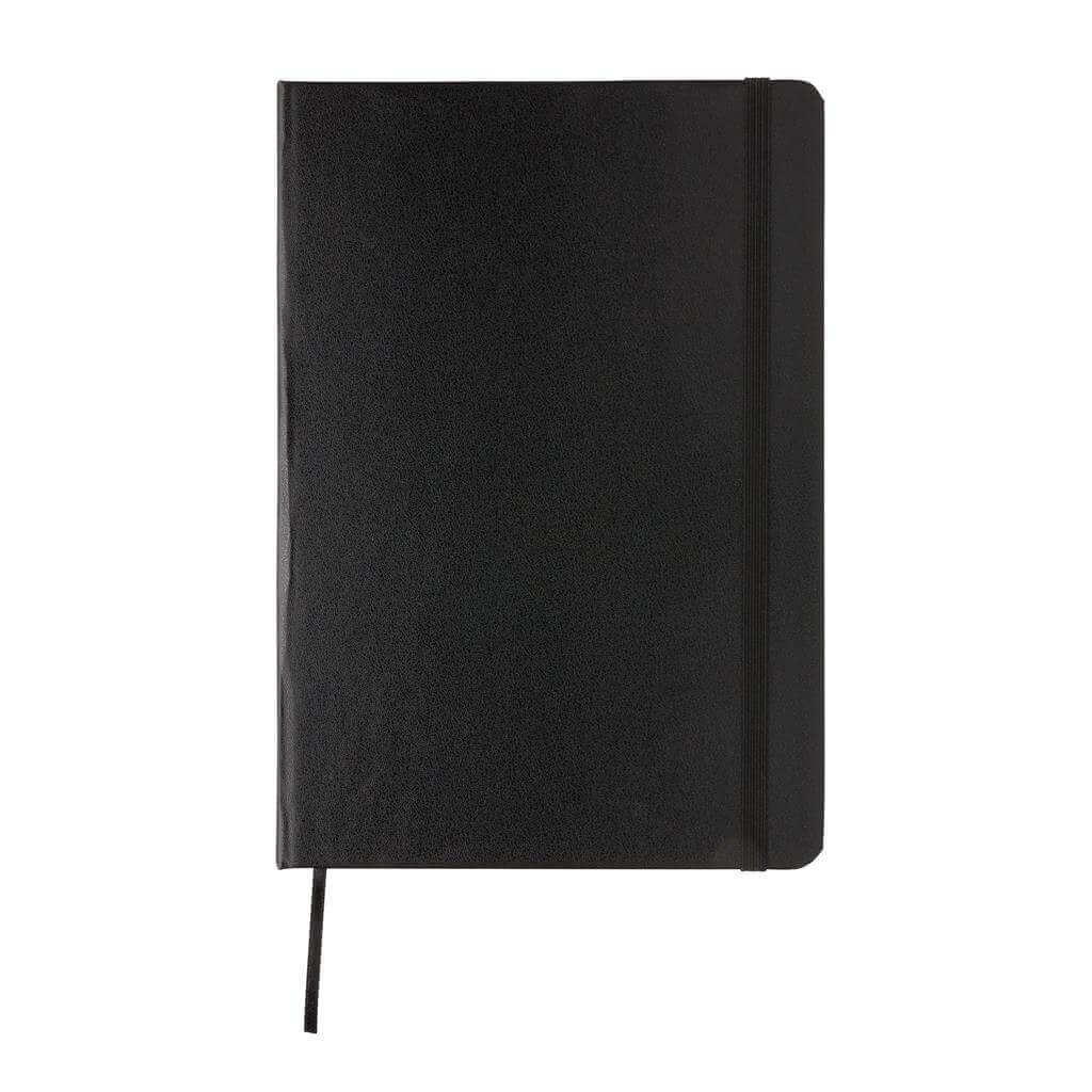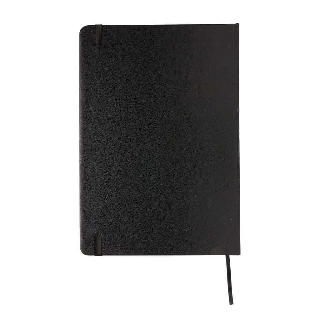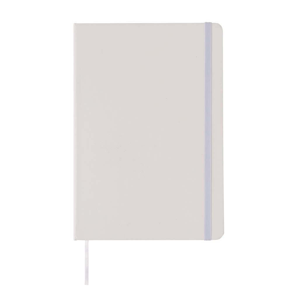 Základní poznámkový blok A5 s pevnými deskami, bez linek, s elastickým zavíráním a záložkou ze stuhy. 144 listů papíru s gramáží 70 g/m2. Krémové stránky. Ideální na kreslení, zápisky a poznámky. PMS color 1: Black PMS color 1: White