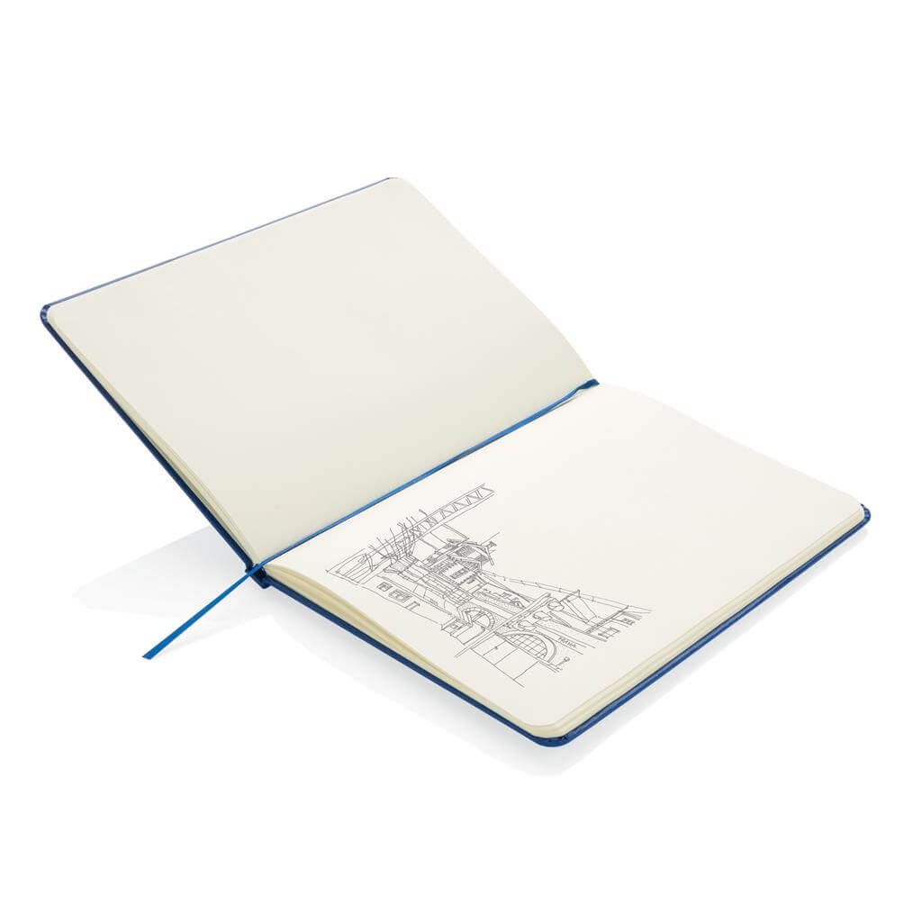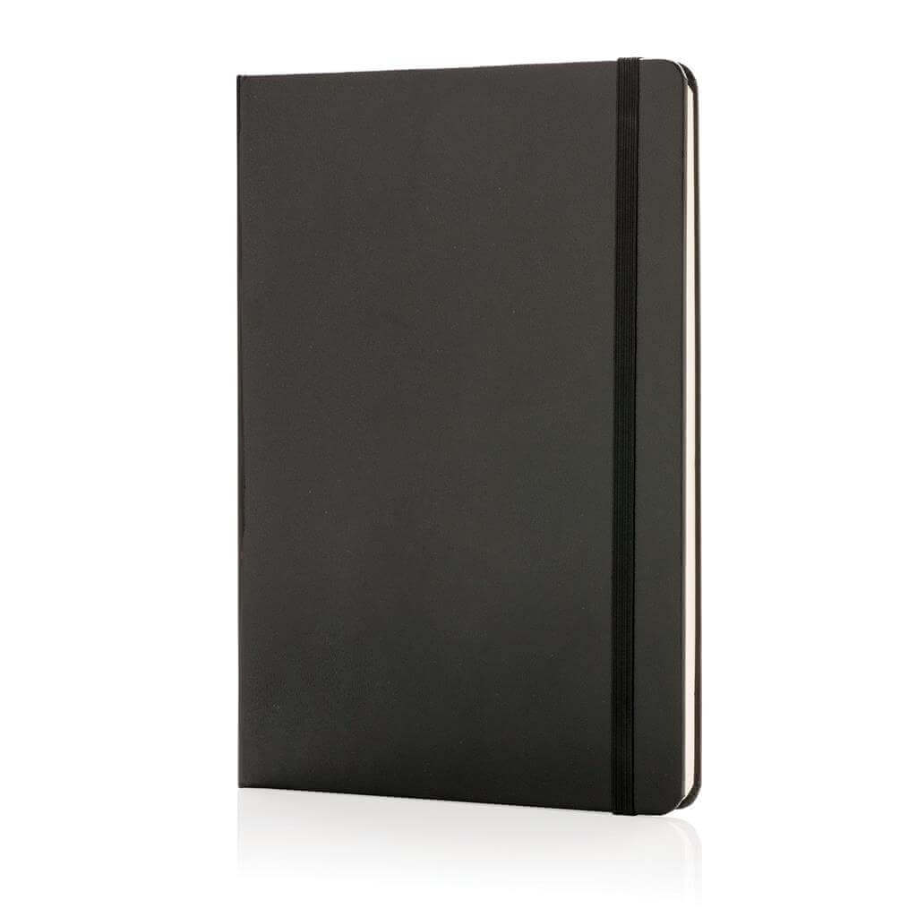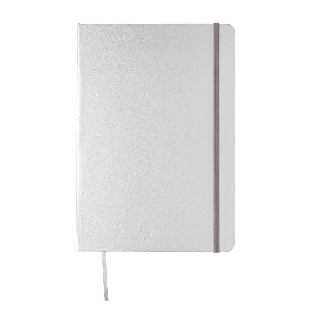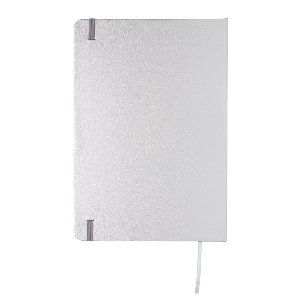 Základní poznámkový blok A5 s pevnými deskami, bez linek, s elastickým zavíráním a záložkou ze stuhy. 144 listů papíru s gramáží 70 g/m2. Krémové stránky. Ideální na kreslení, zápisky a poznámky. PMS color 1: Black PMS color 1: White