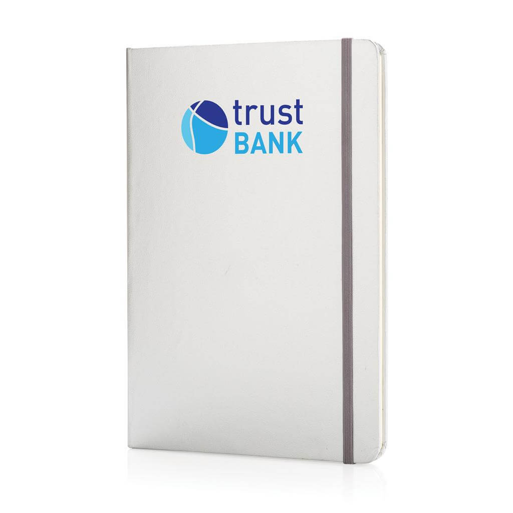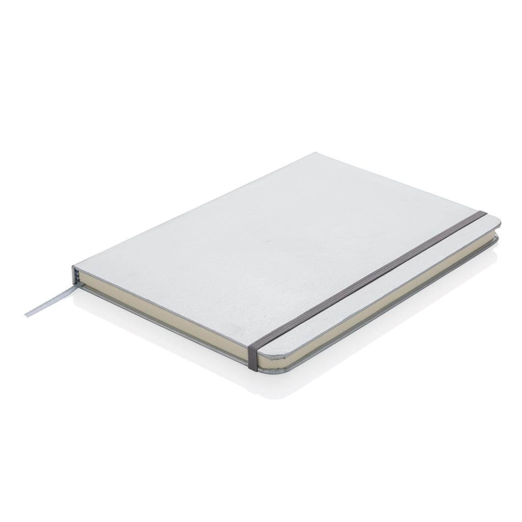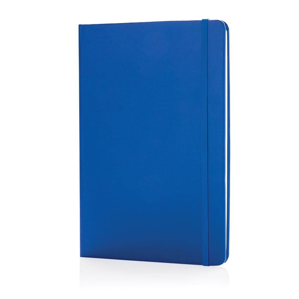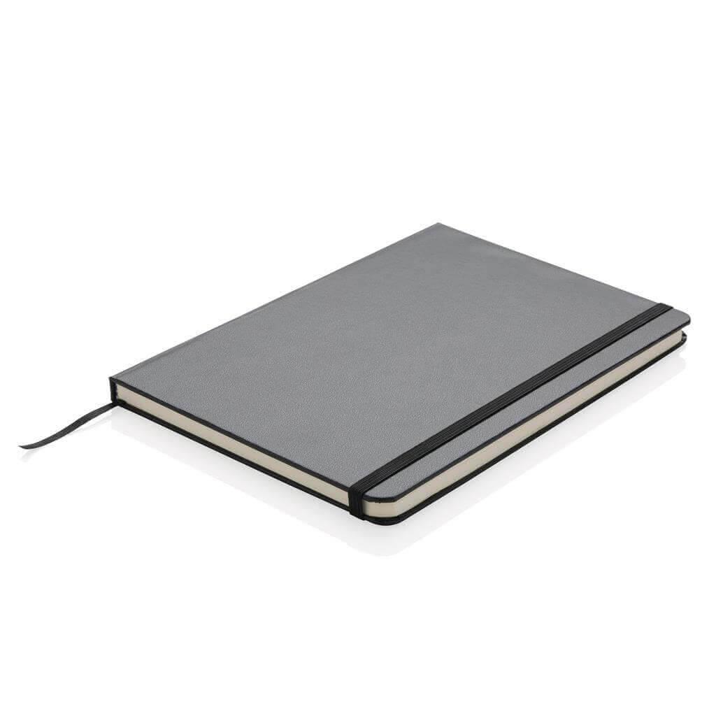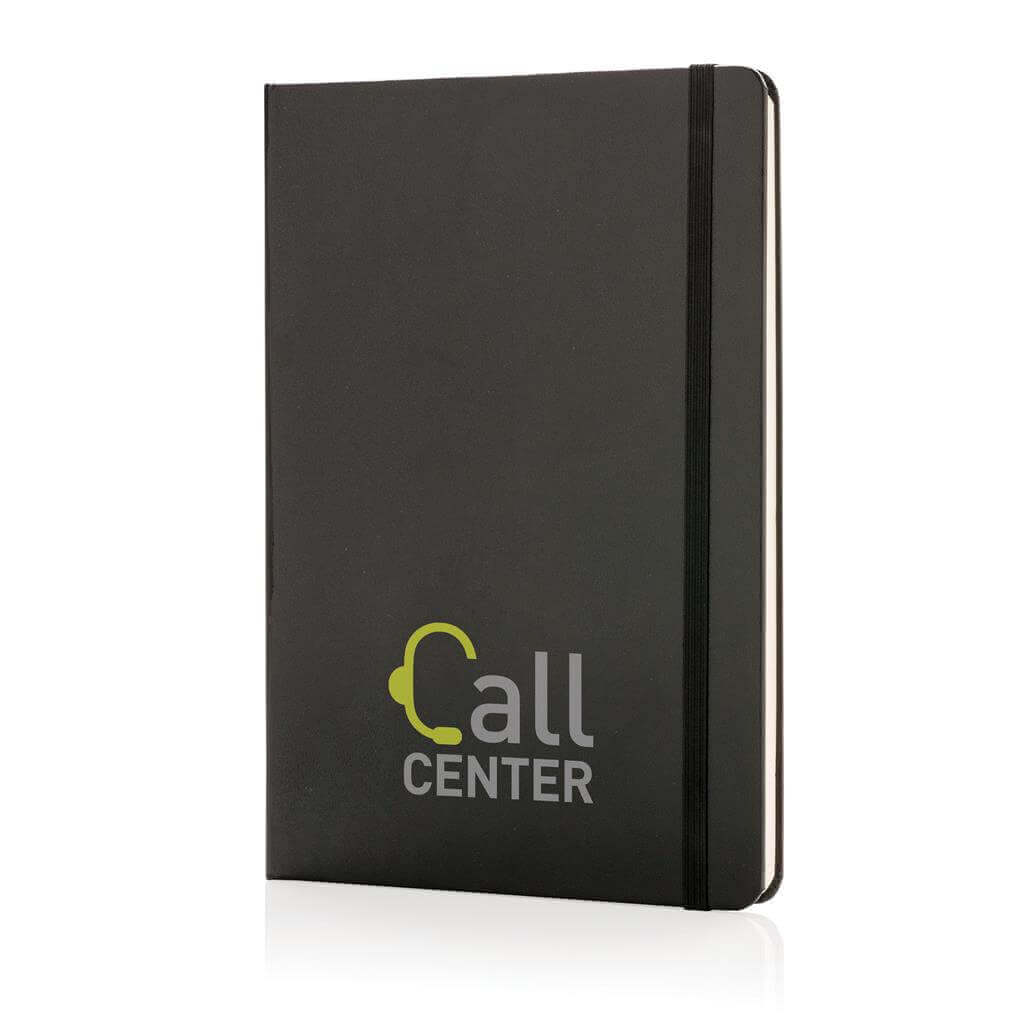 Základní poznámkový blok A5 s pevnými deskami, bez linek, s elastickým zavíráním a záložkou ze stuhy. 144 listů papíru s gramáží 70 g/m2. Krémové stránky. Ideální na kreslení, zápisky a poznámky. PMS color 1: Black PMS color 1: White