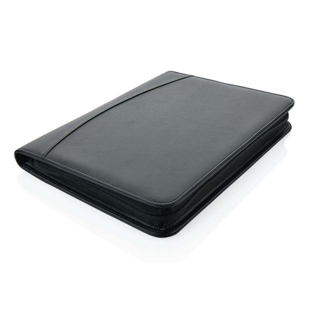 Technické desky PU formátu A4 na zip. Uvnitř: stojan na telefon/tablet, držák telefonu s průhledem, pomocí kterého lze mobilní zařízení zkontrolovat a ovládat. Vhodné pro zařízení iPhone 6 a Samsung S6 apod. Držáky pomůcek, například USB, dobíjecího kabelu a záložního zdroje. Obaly na 5 karet a jeden obal na občanský průkaz. Roztahovací kapsa na dokumenty nebo tablet. Včetně poznámkového bloku A4 z recyklovaného papíru. Kompatibilní se všemi tablety iPad, Android a Microsoft Windows. PMS color 1: Black