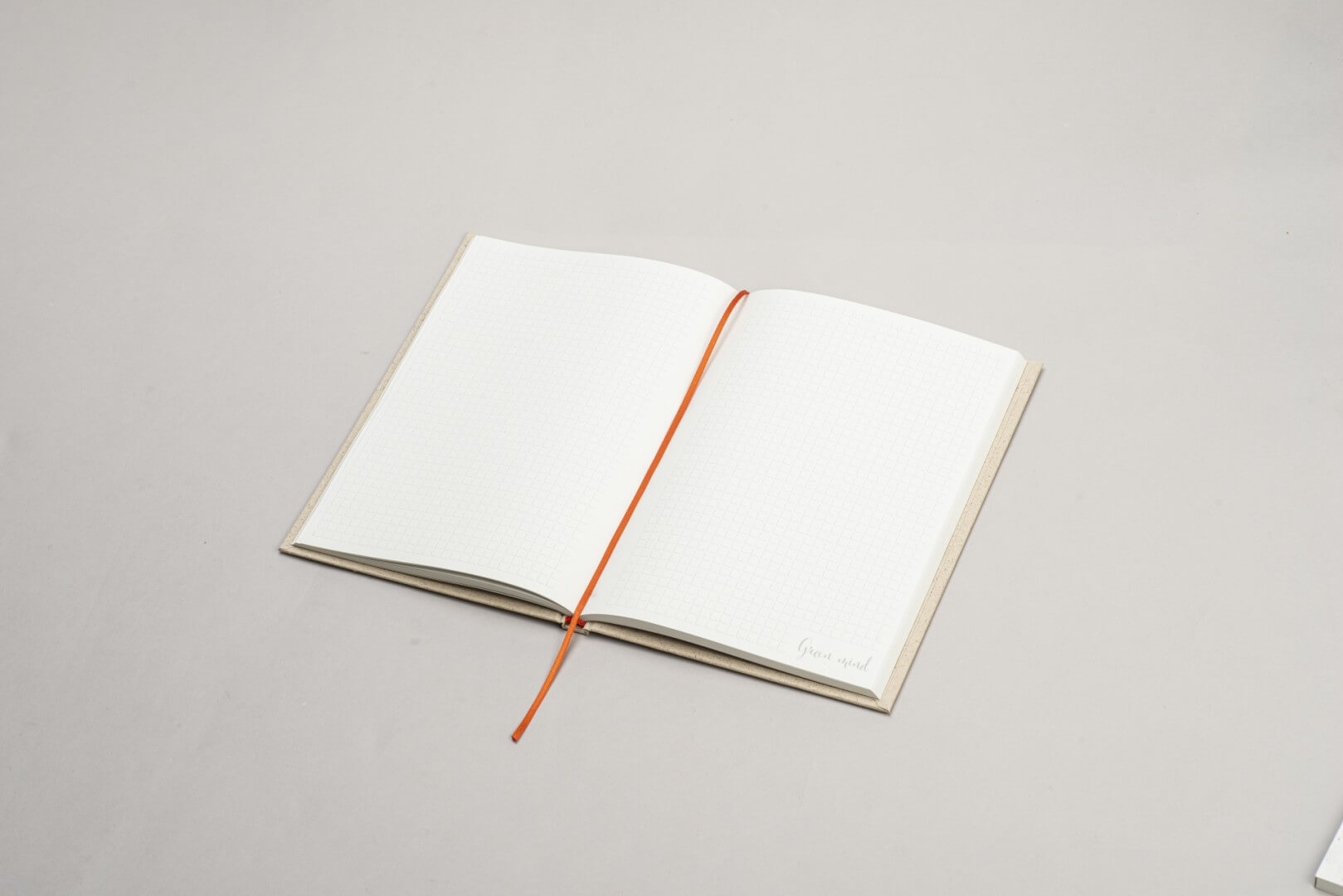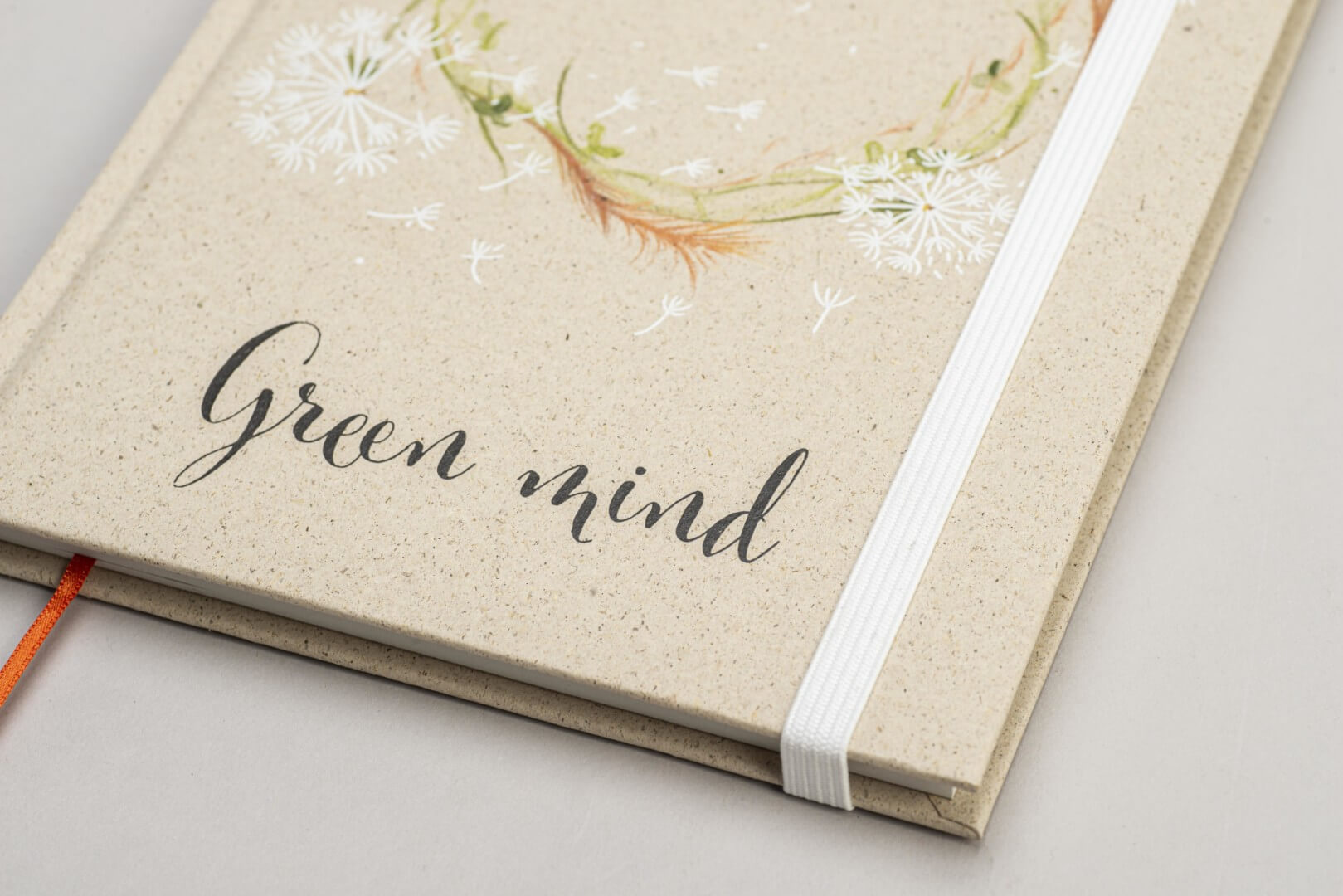 Zápisník formátu A5 s pevným obalem s pevným krytem vyrobeným z recyklovaného papíru s obsahem travových vláken. Standardně rovné rohy. Hromadně baleno v krabicích. Velikost 157x219mm (zavřená). 80 listů, 80 g/m2 recyklovaného ofsetového papíru. Cena zahrnuje plně barevně (CMYK*) vytištěný vnější obal.