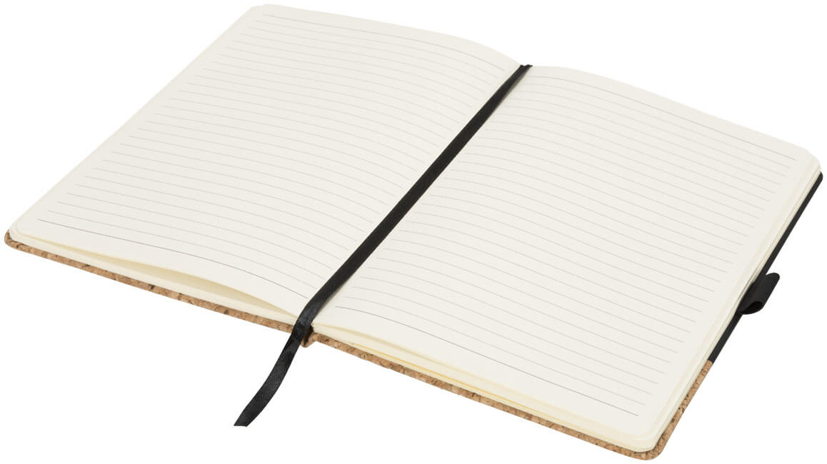 Stylový zápisník v pevných deskách velikosti A5 se spodním dílem z PU. Je opatřen elastickým uzávěrem shodné barvy, stužkou k založení stránky, 80 listy krémového linkovaného papíru (80 gsm) a rozkládací kapsou na zadní straně k uložení malých poznámek. Baleno v černé krabici. Cork, PU Plastic.