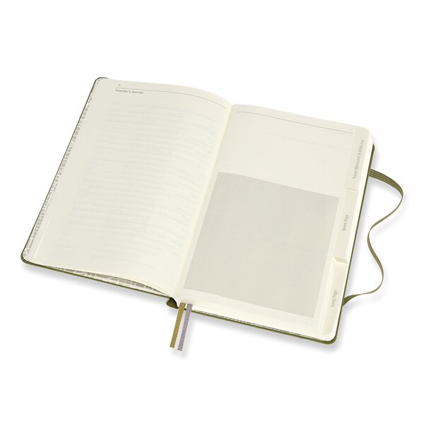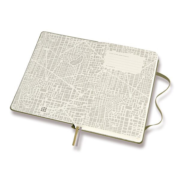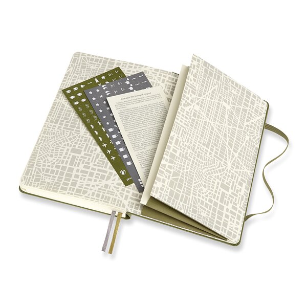 Zápisník s pevnou, v zádech šitou vazbou v kartonových deskách s reliéfním zdobením. Obepíná jej pružná páska proti samovolnému otevírání. Zápisník je vybaven 2 textilními záložkami, dvojitou vnitřní kapsou, barevnými samolepkami a letákem s historií MOLESKINE. Zápisník je retolován do tematických sekcí pomocí záložek. Gramáž papíru 70 g/m2, neobsahuje kyseliny.