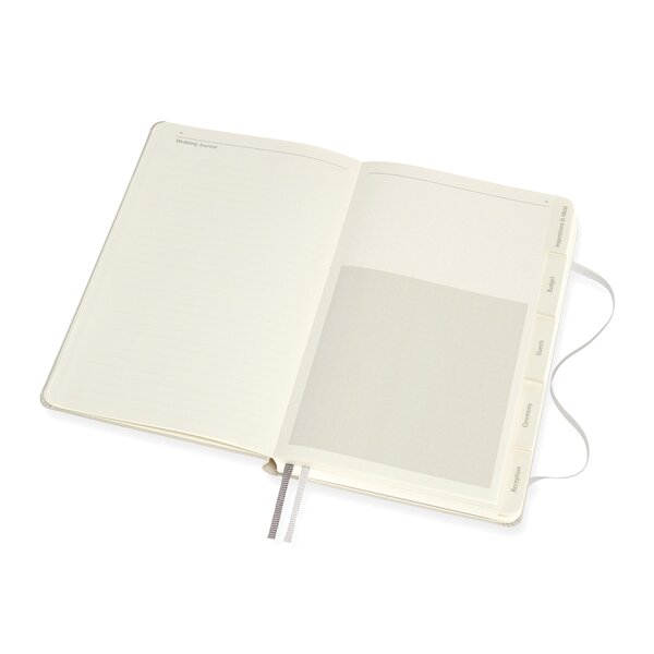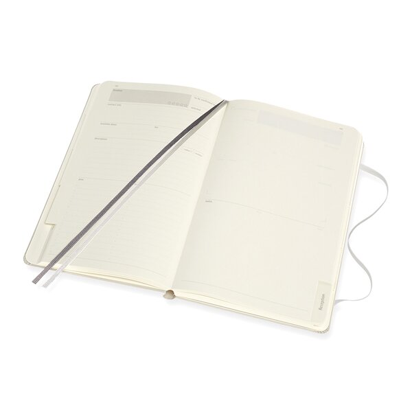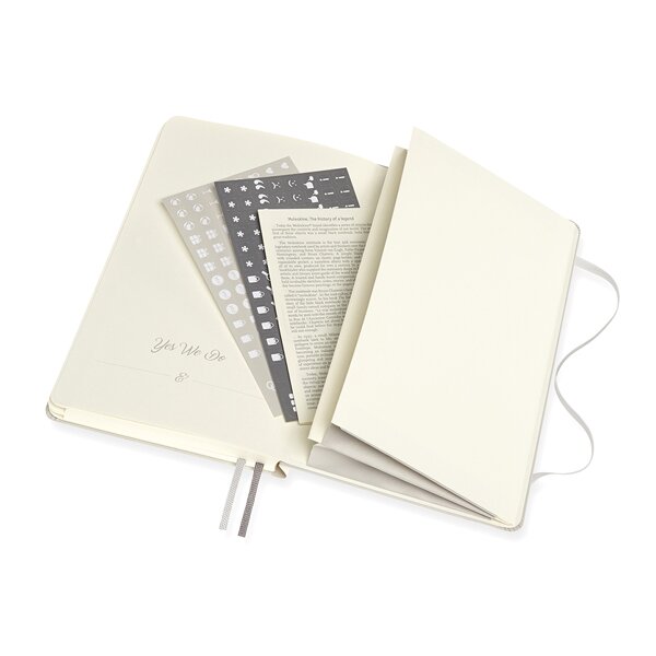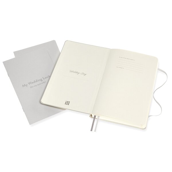 Zápisník s pevnou, v zádech šitou vazbou v kartonových deskách s reliéfním zdobením. Obepíná jej pružná gumička proti samovolnému otevírání. Zápisník je vybaven 2 textilními záložkami, dvojitou vnitřní kapsou, barevnými samolepkami a letákem s historií MOLESKINE. Zápisník je retolován do 10 tematických sekcí se specifickým rozvržením stran (inspirace a nápady, rozpočet, hosté, obřad, svatební hostina, květiny a dekorace, fotografie, video a hudba, svatební cesta, poznámky, adresář), obsahuje 2 samostatné zápisníky pro nevěstu, předsvatební 12-měsíční odpočet před svatbou i prázdné strany.