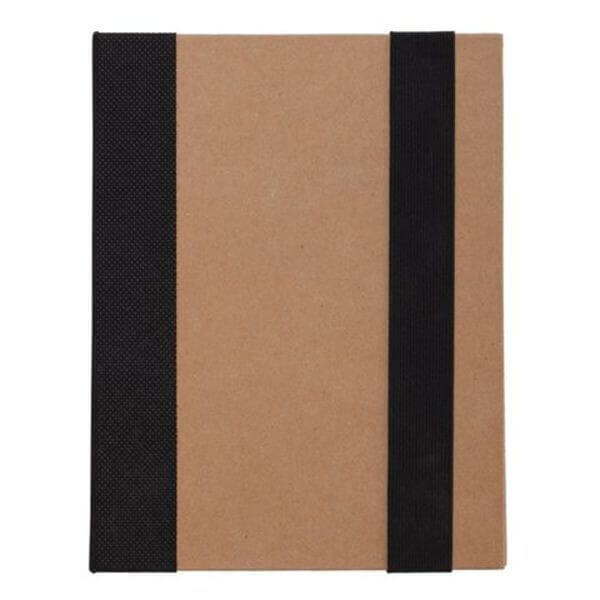 Poznámkový blok v lepenkovém obalu s elastickou uzavírací páskou. Dodává se s lepenkovým kuličkovým perem s plastovou špičkou a klipem. Obal: 2 mm silná lepenka. Uvnitř: 80 g bezdřevého papíru 140 stran. 2x 80 g žluté lepící papírky, 5 x sada lepících papírků z PET po 25 lístcích.