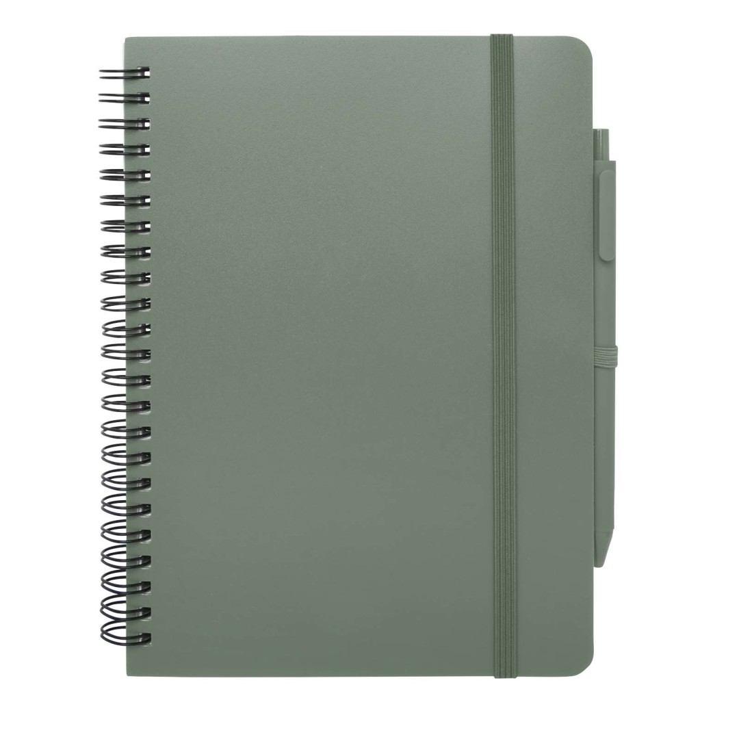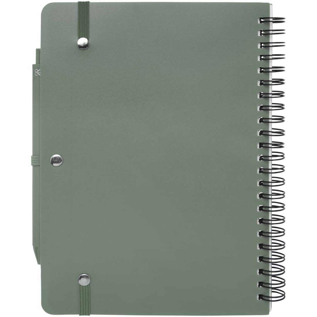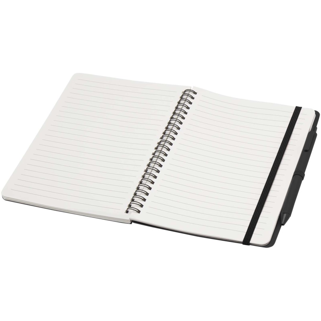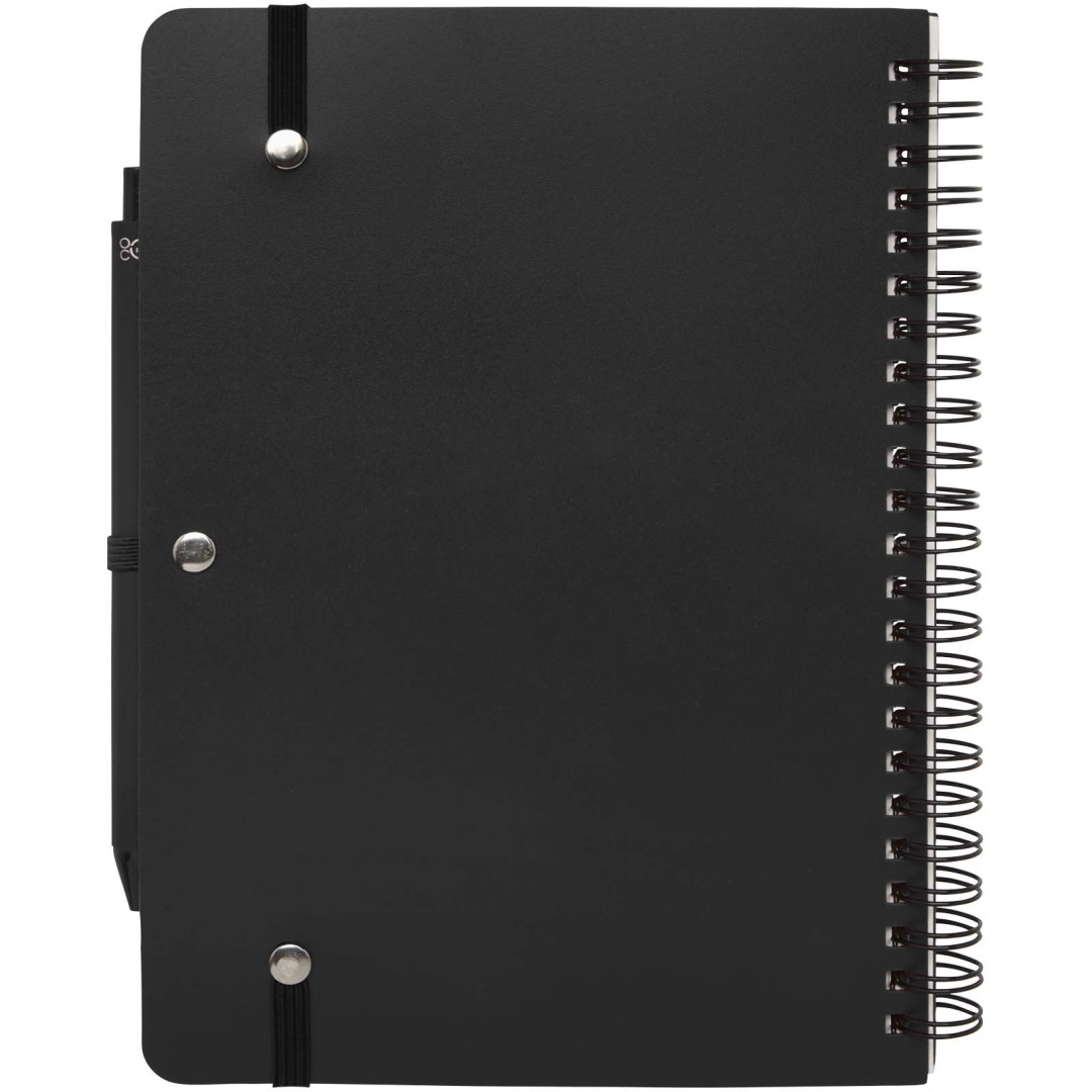 Zápisník Thalaasa formátu A5 s pevnou obálkou je vyroben z recyklovaného plastu, který by jinak skončil v oceánu, s 80 linkovanými listy papíru v krémové barvě o gramáži 70 g/m². Zápisník má zaoblené rohy, elastické zavírání a poutko na pero. Kuličkové pero s černým inkoustem je také vyrobeno z recyklovaného plastu z oceánu. Délka psaní: 1000 metrů. Rozměr hrotu: 1,0 mm.