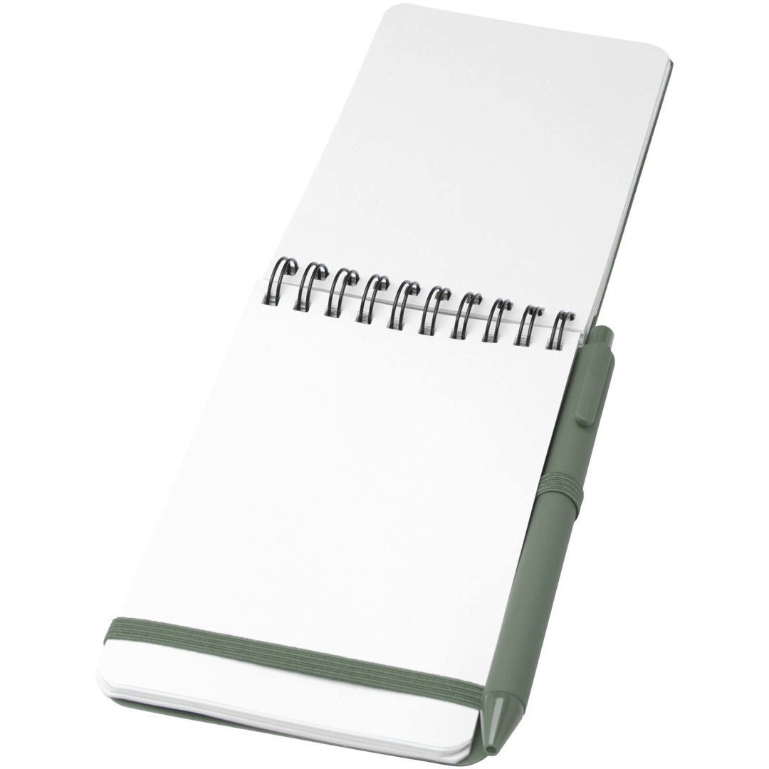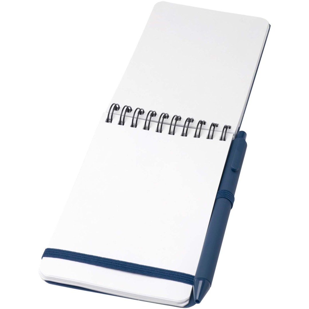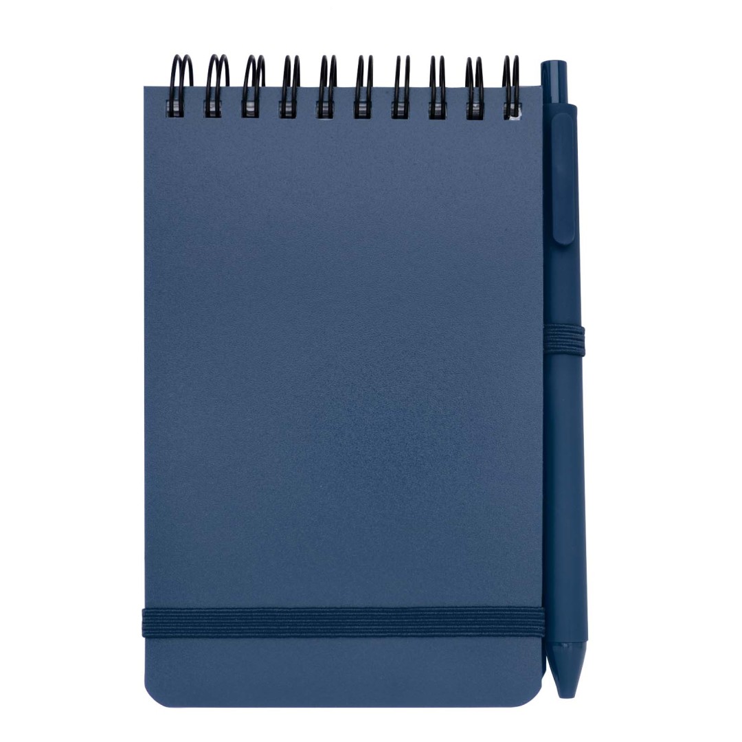 Zápisník Thalaasa formátu A6 s pevnou obálkou je vyroben z recyklovaného plastu, který by jinak skončil v oceánu, s 80 linkovanými listy papíru v krémové barvě o gramáži 70 g/m². Zápisník má zaoblené rohy, elastické zavírání a poutko na pero. Kuličkové pero s černým inkoustem je také vyrobeno z recyklovaného plastu z oceánu. Délka psaní: 1000 metrů. Rozměr hrotu: 1,0 mm.