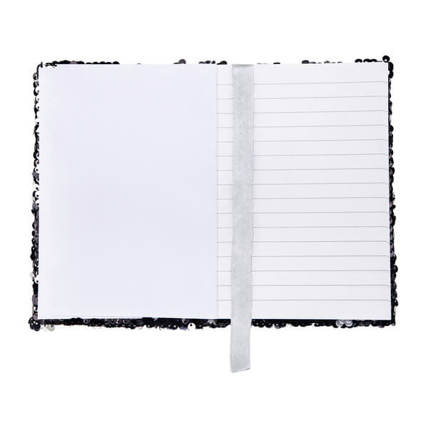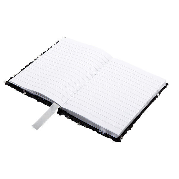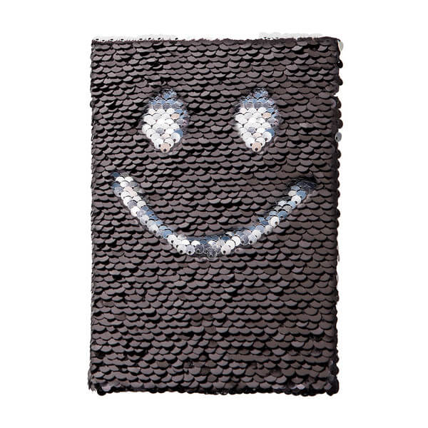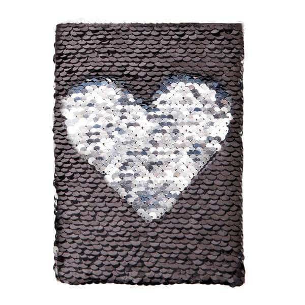 Lesklý zápisník B6 s přebalem s oboustrannými šupinami v černé a stříbrné barvě. Pokud rukou přejedete po šupinách, změní barvu a vzhled. Stříbrná stuha (šířka 15 mm) s prostorem pro vaše logo. Papír 70 g/m2, 160 stran.