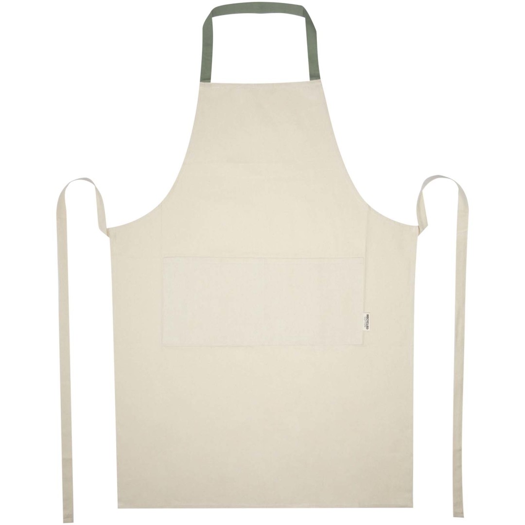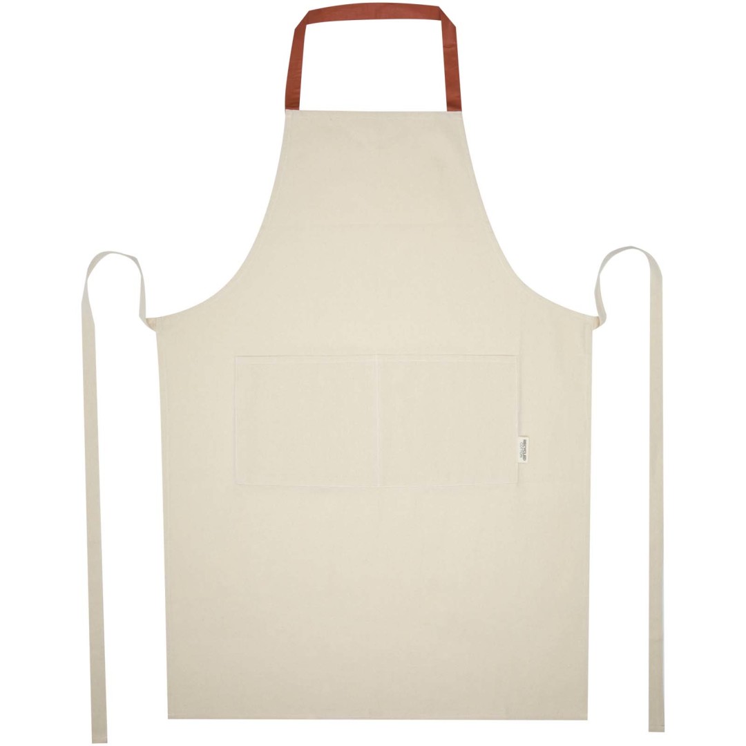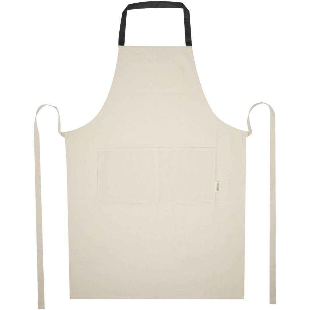 Zástěra Nia je vyrobena ze 100% recyklované bavlny s certifikací GRS s gramáží 200 g/m². Tato zástěra v přírodní bavlněné barvě s krčním úvazem v kontrastní barvě ochrání vaše oblečení při vaření. Zástěra Nia se dvěma kapsami vedle sebe o celkové velikosti 45 × 20 cm a 1 metr dlouhým zádovým úvazem zajišťuje praktičnost i styl v kuchyni.