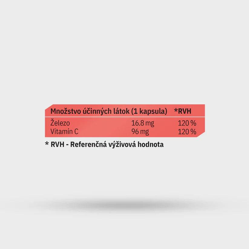 Vysoce vstřebatelná forma železa ve formě bisglycinátu železnatého (Iron Chelate), obohacená o vitamín C pro lepší vstřebávání. Nezatěžuje trávicí systém a je šetrná k žaludku. Přispívá k tvorbě červených krvinek, hemoglobinu a pomáhá snížit únavu a vyčerpání. Vhodné při zvýšené potřebě železa, zejména pro ženy, sportovce či vegetariány. Složení: inulin (vláknina z kořene čekanky), Vitamin C (kyselina L-askorbová), veganská kapsle (HPMC), bisglycinát železnatý, kapsle (HPMC).