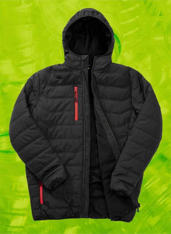 · Vnější: 100% polyester, recyklovaný (TOPGREEN®) · Polstrování: 160 g / m², 100% polyester (recyklovaný, REPREVE®) · Tělo a kapuce podšívky: 200 g / m², 100% polyester, recyklované rouno (TOPGREEN®) Podšívka rukávu: 100% polyester (recyklovaný, JIAREN), Strečový materiál s TPU membránou, YKK plný zip s proužkem chránícím před větrem a ochranou brady, Boční a náprsní kapsy na zip v kontrastní barvě, Vnitřní kapsa, Závěsné poutko, Měkce lemované manžety