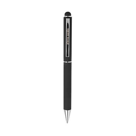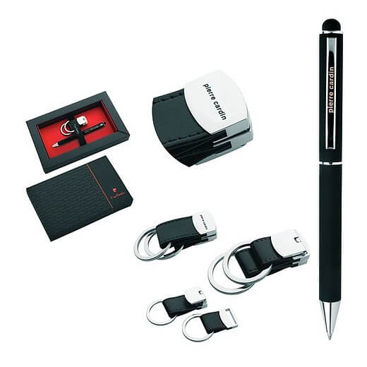 Značková sada kožené klíčenky a černého kuličkového pera CLAUDIE Pierre Cardin. Klíčenka z pravé kůže obsahuje dva kroužky na přichycení, které od sebe lze oddělit a vytvořit tak dvě klíčenky. Kuličkové pero má hliníkové tělo a gumovou povrchovou úpravu, která je velmi příjemná na dotek. Pero má stříbrné detaily, obsahuje stylus a kvalitní modrou náplň s hrotem 1 mm. Baleno v luxusní krabičce Pierre Cardin, dodáváno s certifkátem pravosti. Doporučená technologie tisku: laser L1, UV tisk (pouze pro pero) Maximální velikost tisku: klíčenka 15 × 5 mm, pero 40 × 6 mm Rozměry: klíčenka 3,3 × 6,9 × 1,5 cm kuličkové pero 1 × 13,5 cm balení 21, 4 × 13,4 × 3,5 cm 484 Kartonové množství v ks: 10